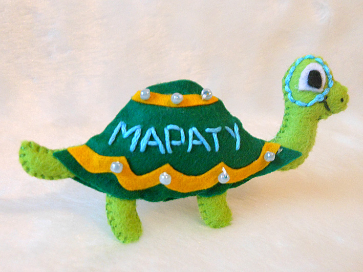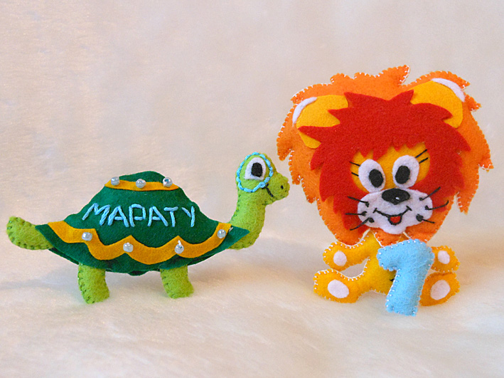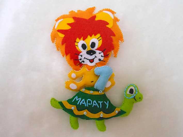На Черепахе вышито имя малыша, а Львенок держит цифру "1".