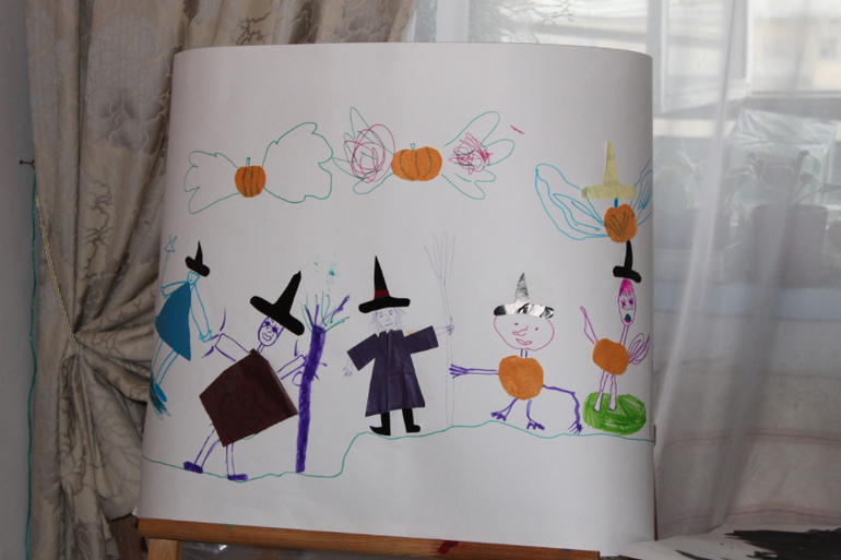Наша поделка "шабаш". Во время аппликации было придумано несколько историй, в основном смешных. Например о том, как тыквы отрастили себе крылья и полетели на юг, с приходом холодов...
