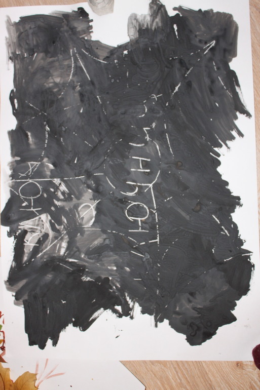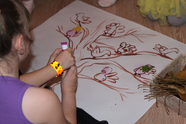 Это и аппликация «ведьмы на пикнике», и раскраска паутины для поиска скрытых слов (ой, какие крики восторженные были « у меня появилась паутина!» «А у меня буква!!!!!»). И разукрашивание шаров фломастерами. И спрятать птичек, за которыми охотятся кошки, среди листьев. В общем, все, связанное с творчеством.