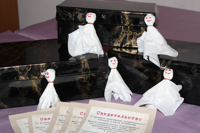 Посмеялись над игрой с признаниями. После девичника девочки в шутку искали мешок с золотом под лавками (из игры в предсказания) и с удовольствием изображали разных персонажей (игра «фанты»).