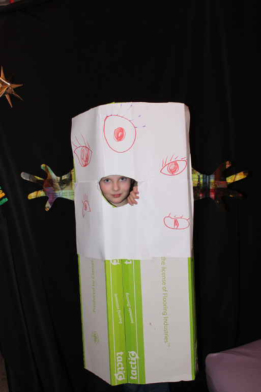 А это моя старшая доча примеряет костюм чудовища. И очень сильно напоминает мне чудика из Шрека. Помните, лабораторию Феи Крестной?