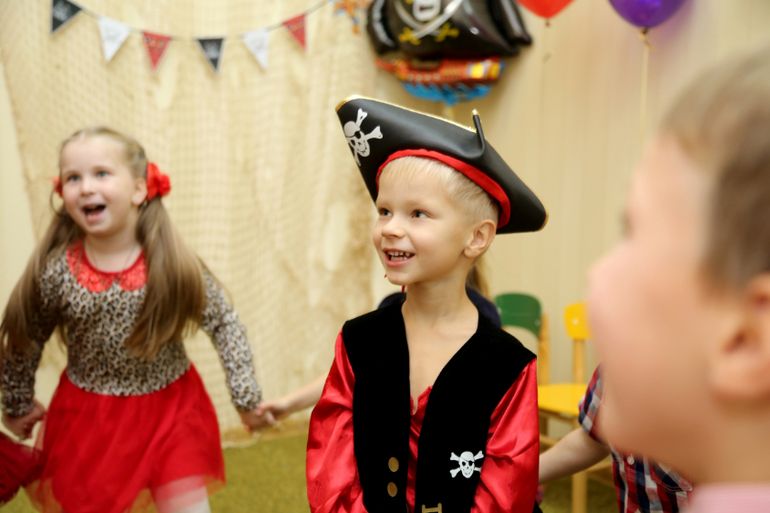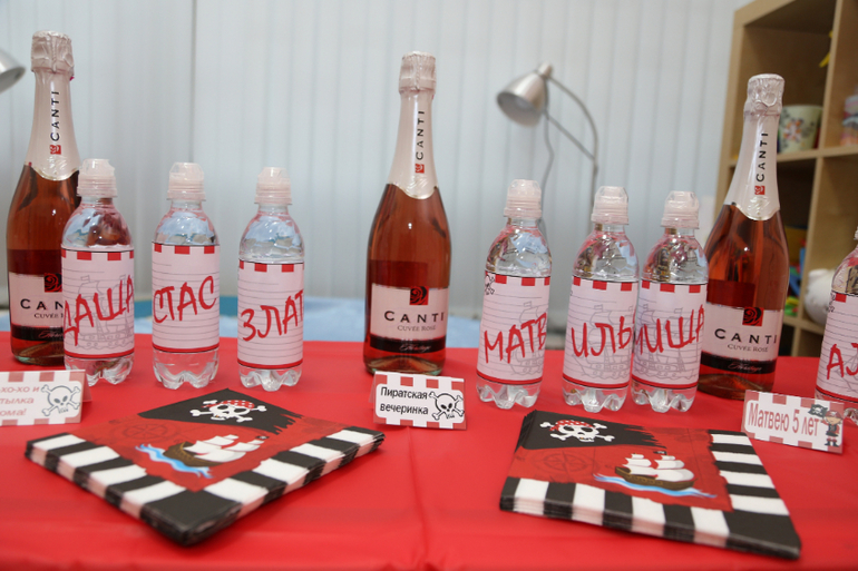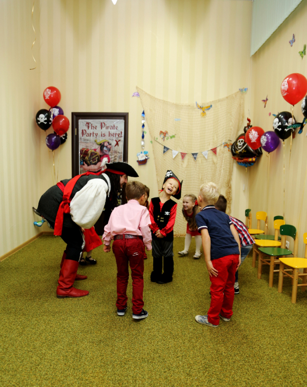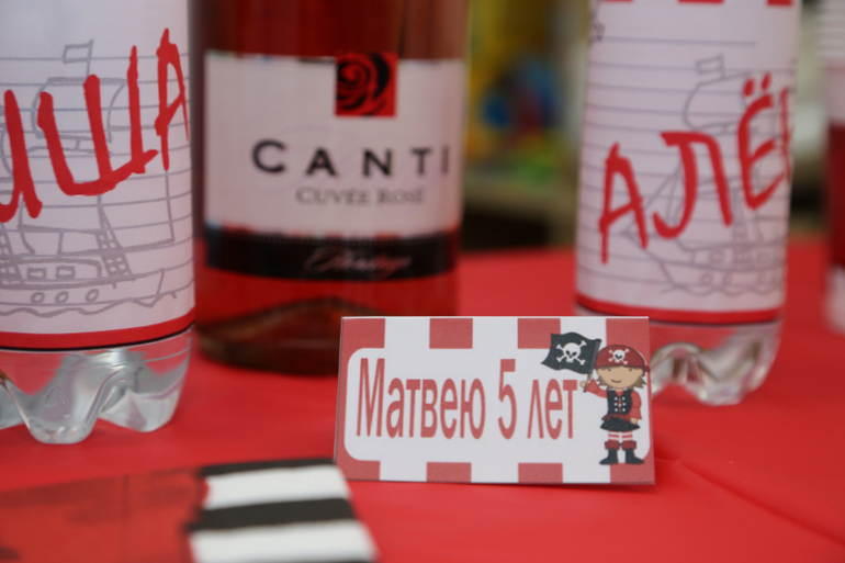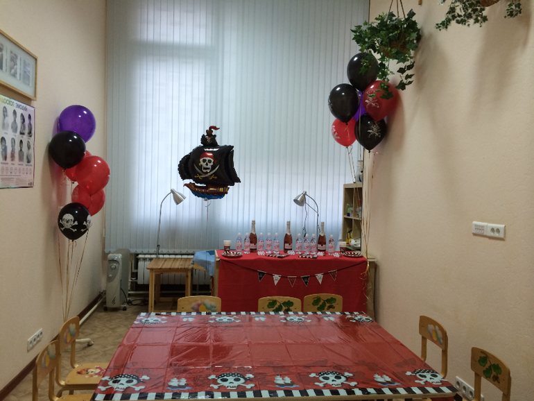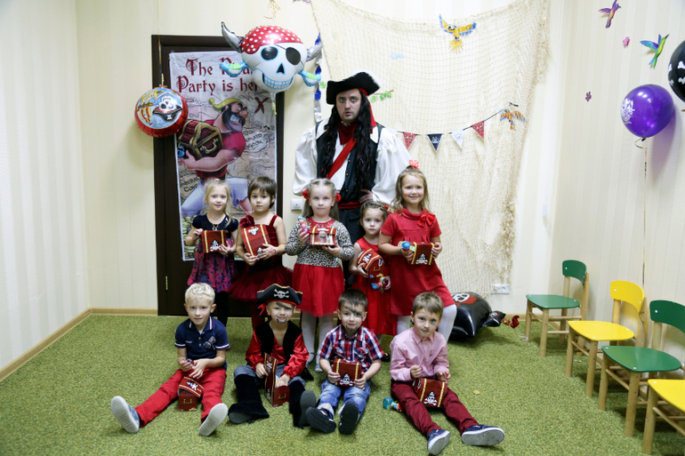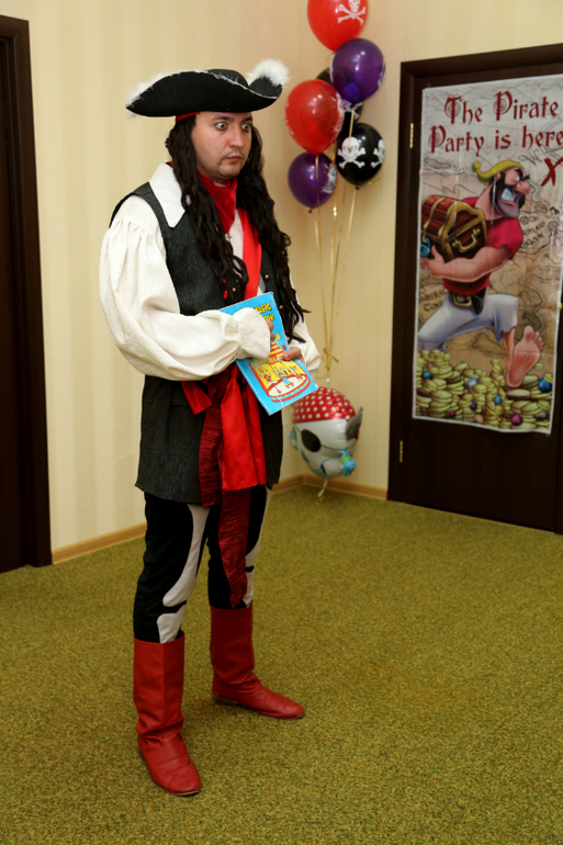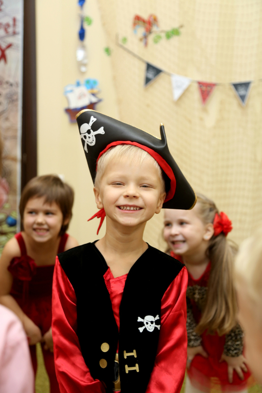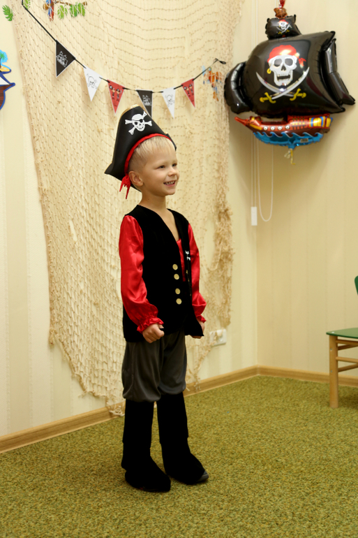 Так как украшала я все в черно-красной гамме, то попросила мамочек соблюсти дресс-код для деток с наличием красного цвета у них в наряде. Своего именинника я нарядила пиратом, чтобы было понятно, кто тут главный)))))).