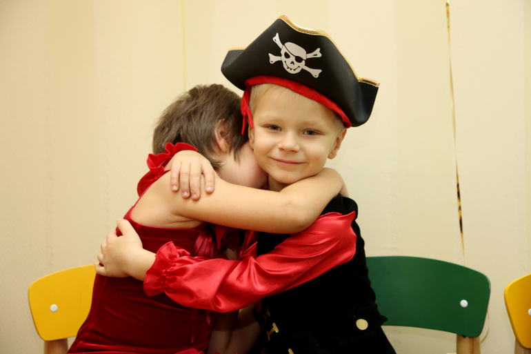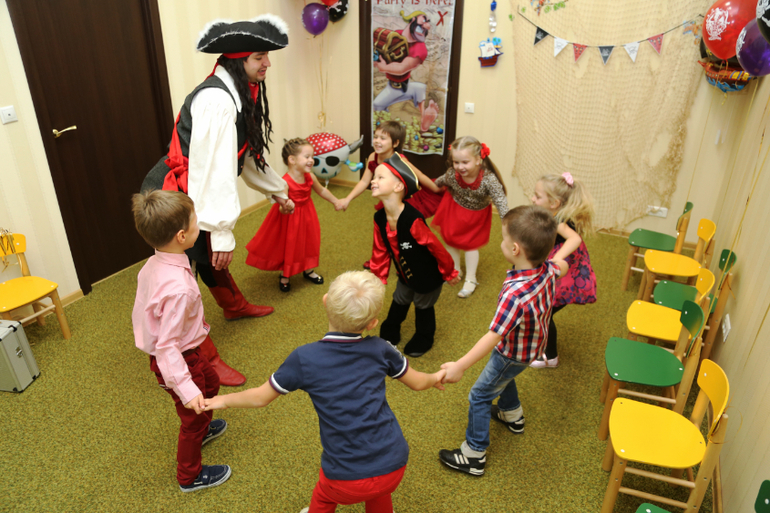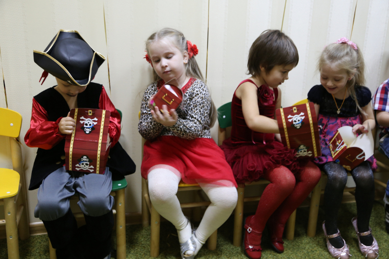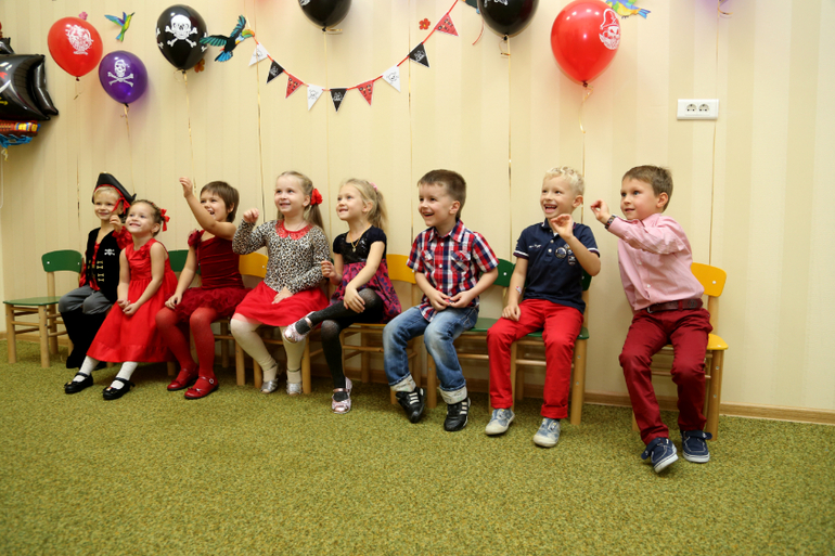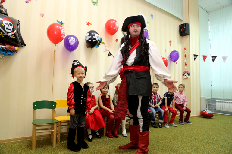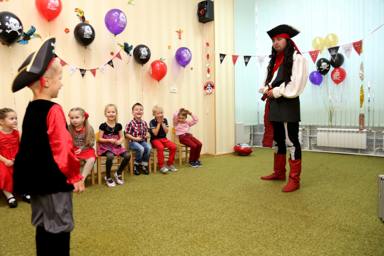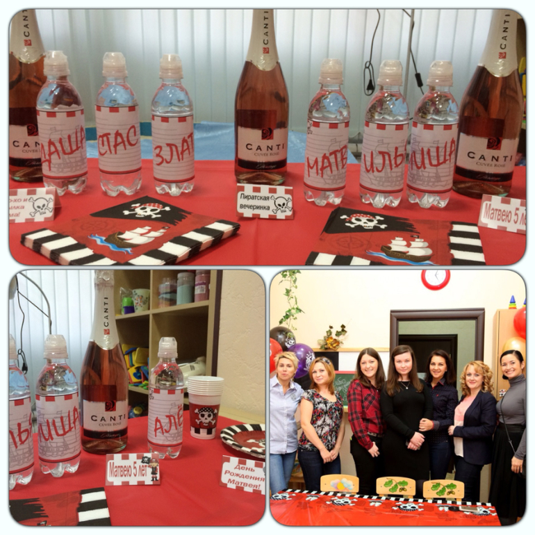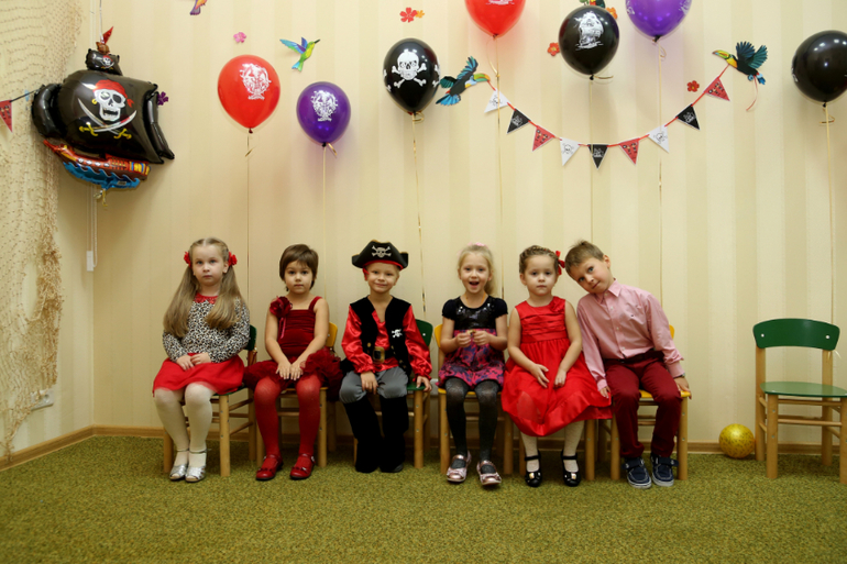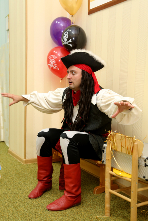 Так как украшала я все в черно-красной гамме, то попросила мамочек соблюсти дресс-код для деток с наличием красного цвета у них в наряде. Своего именинника я нарядила пиратом, чтобы было понятно, кто тут главный)))))).