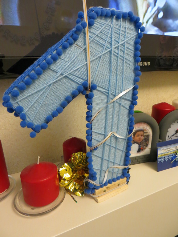 С грехом пополам я сделала единичку))) руки-крюки, но как смогла) Двойную картонку обмотала ниткой и обшила тесемочкой, муж прибил опору, чтобы не падала.