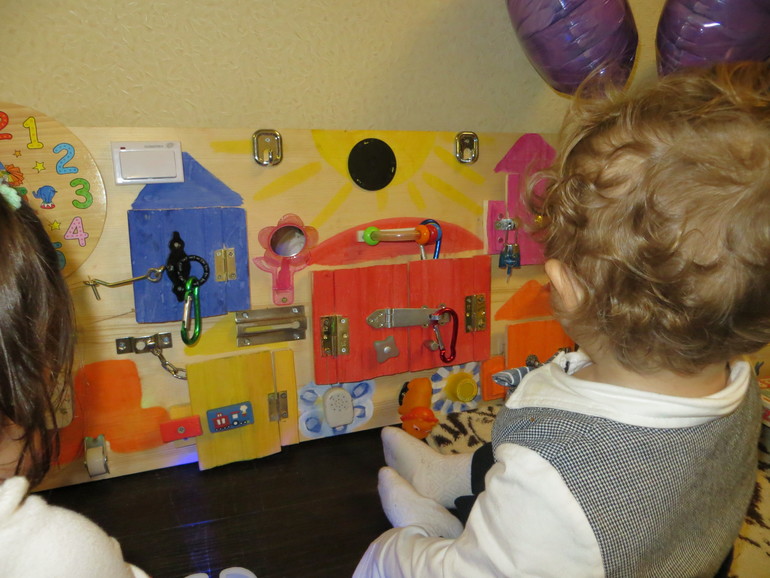 Самодельный бизиборд (мы с мужем делали). Здесь подробный пост писала (кому интересно загляните), как мы его делали - ссылка