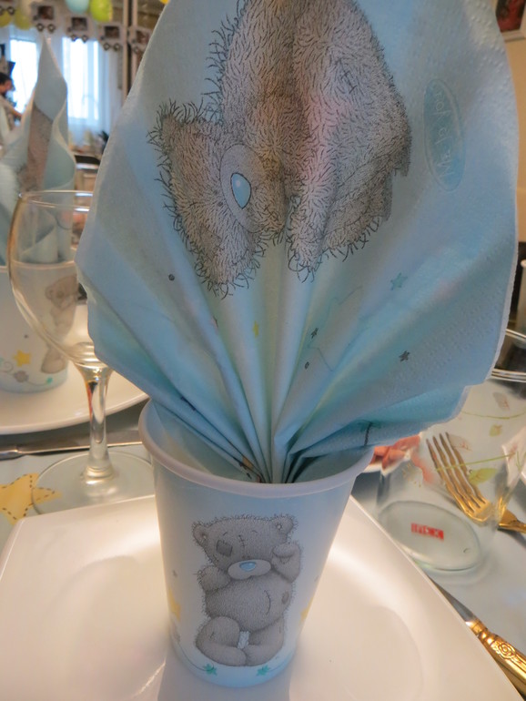 Впрочем как всегда, Веселая затея помогла. Все достаточно недорого: Скатерть (120 руб), салфетки (73 руб), растяжка (180 руб) стаканы (50 руб - 6 штук), шарики (по 5 руб штука) и гофрированный шар с мишками (109 руб) - все заказала там. Там еще были колпачки из этой серии и вымпелы (треугольники-растяжка) кому интересно ссылочка на их сайт