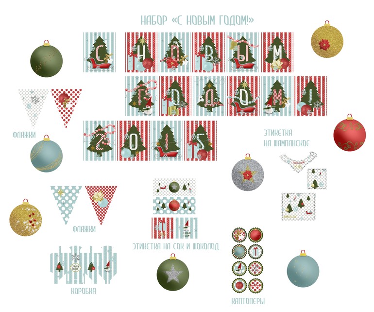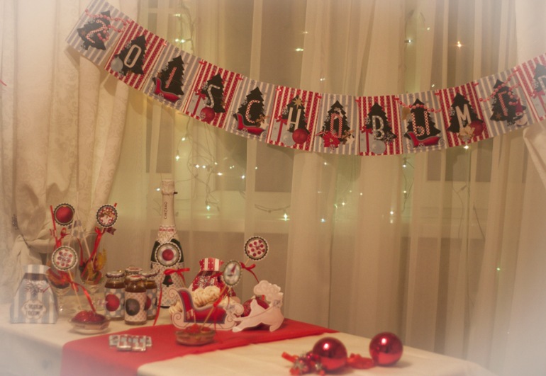 3. Собранная, полностью готовая версия. Сюда дополнительно входит: скатерть, салфетки новогодние, свечи, свеча фигурная, хлопушки, маски.