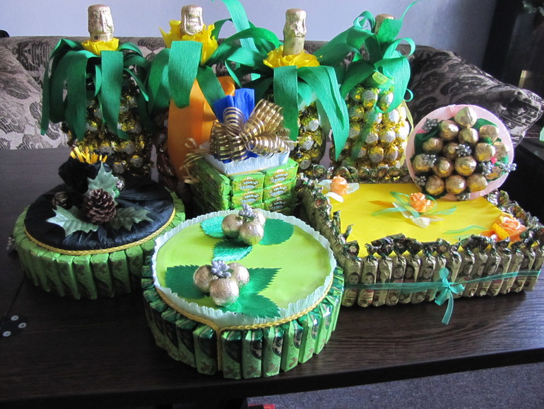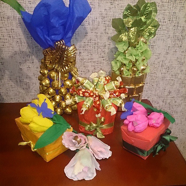 ПодаркиТакой подарок будет приятен всем, и взрослым, и детям. Он вкусный во всех смыслах и на стол поставить - красиво. Можно сделать с шампанским, с детским шампанским, можно в виде топиария, или просто букета. Можно подарить учителю (шикарный подарок, дарили в школе, учителя хвастались), друзьям, да кому угодно!