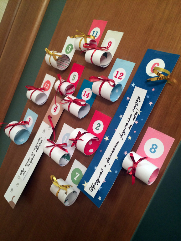 1. Свернутые трубочки с заданиями внутри. Самый удобный и простой в использовании календарик, который можно повесить на дверь или стенку шкафа. Кроме заданий можно вложить подсказки, где искать сюрприз. На 14 дней - 500р, на 31 день - 800р.