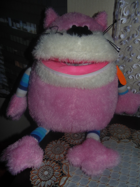 рот у кота открывается и , туда мы наложили всякие вкусности разности , Киндеры , пазлы " Маша и Медведь " ))) :