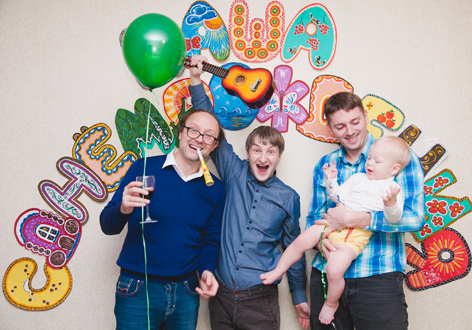 Мужчины поздравляют Машу: наш близкий друг Димка, он театральный актер, заслуженный артист России и очень веселый и добрый человек, папа Дима и Кирюша с папой Стасом.