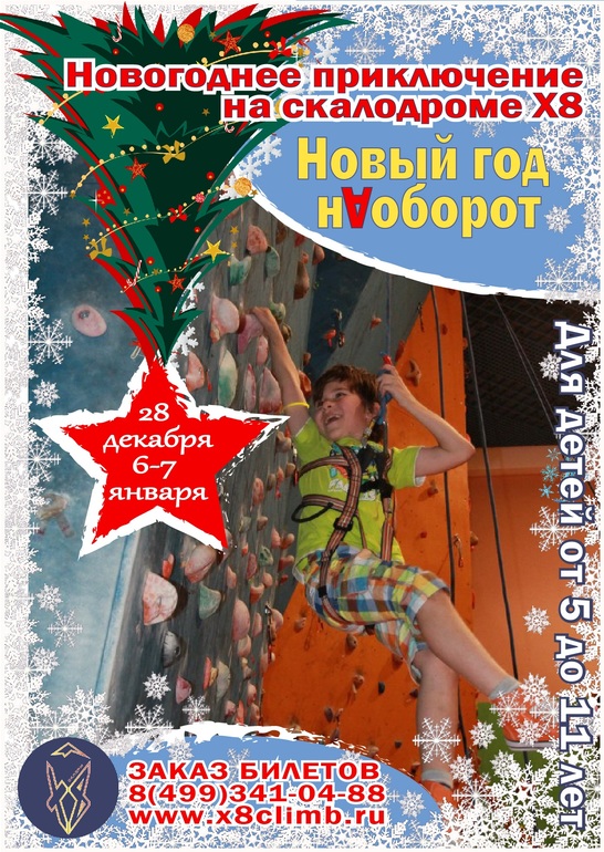 Новый ГодДорогие мамы, Новый год - это самый ожидаемый праздник в году! Кому как не вам это знать!? )))) И каждый год вы стараетесь сделать что-то необычное и новое для своего ребенка. Мы спешим к вам на помощь!! Приглашаем вас и ваших детей на экстремальную и веселую новогоднюю ёлку на скалодроме - "Новый год наоборот". Дети очень любят лазать - это у них в крови, а когда речь идет о спасение новогоднего настроения, они готовы перевернуть мир вверх дном!