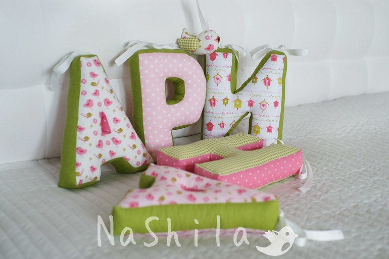 Мои девочки принесли Аришке памятные подарочки - гипсовый набор для сладких ножек и вот оно- ЧУДО : НАШЕ ИМЯ, в виде веселых подушек! Сказать, что я была рада, это ни чего не сказать!!! Но, радость моя приходила ко мне постепенно, с каждым днем после, когда я развесила эти милые буковки к нам на кроватку! В комнате сразу стало как-то уютнее и веселее!