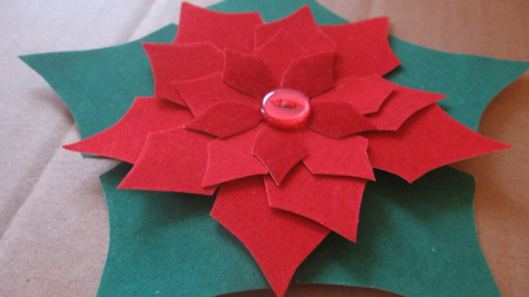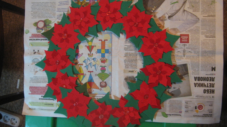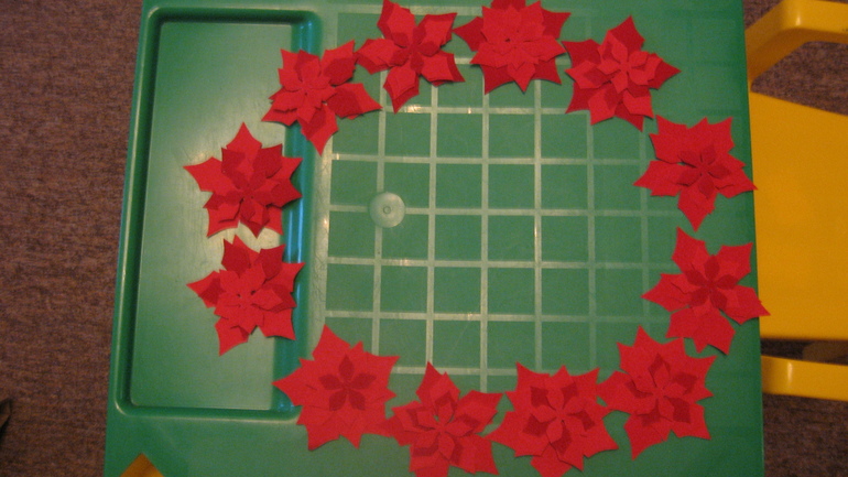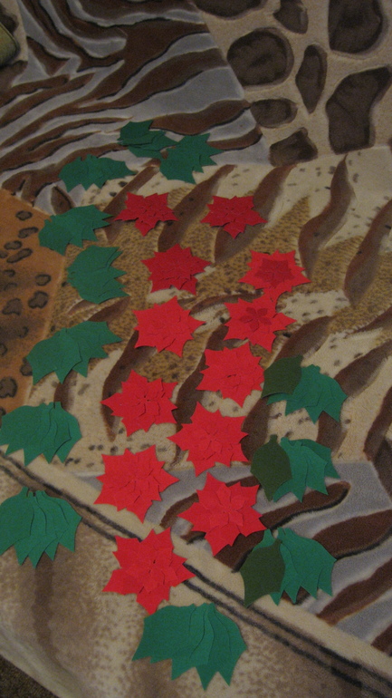Основной материал - бархатная цветная бумага зелёного и красного цветов. Из нее я вырезала заготовки (4-х разных размеров для цветочков и одинаковые для листиков). Всего получилось 60 листочков и 48 цветочков. Этого хватило на 12 готовых форм.
