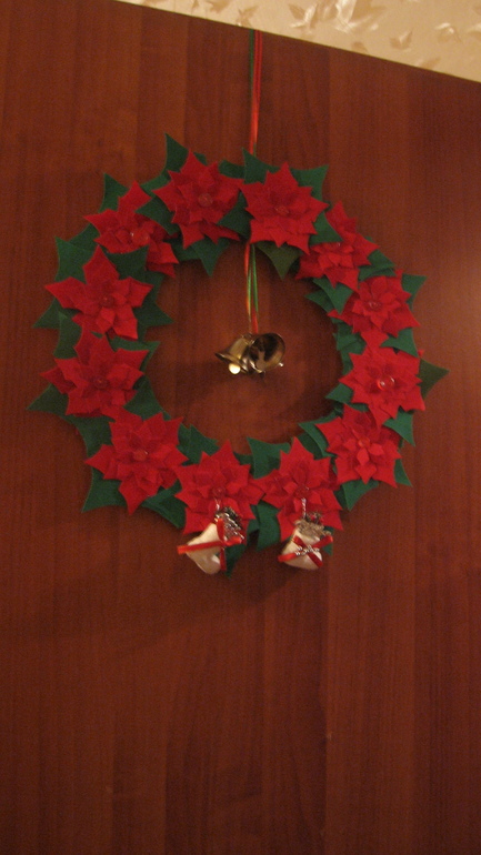 Цветы наклеили на картон, подвесили колокольчики и сапожки. И на дверь!