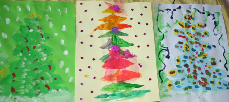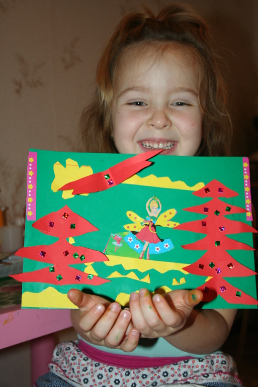 Потом у Камилки на занятии по рисованию случился неприятный конфуз, ее рисунок по ошибке забрал другой ребенок. Сначала зайка, конечно, очень расстроилась и расплакалась, но потом сама нашла решение - сделать новую поделку. И ее пробило! За несколько дней она совершенно самостоятельно в технике паспарту нарисовала более пяти елок. Я только помогала украшать.