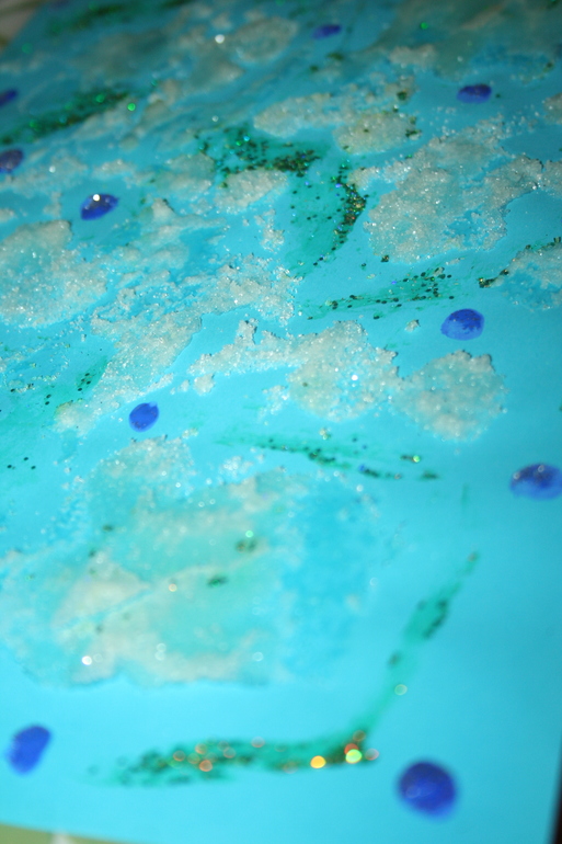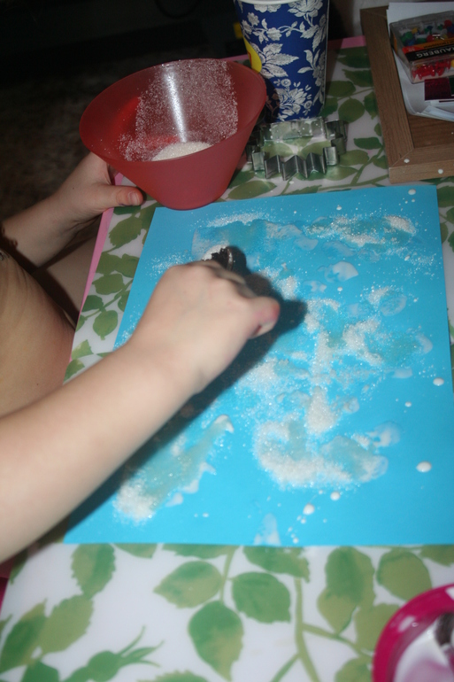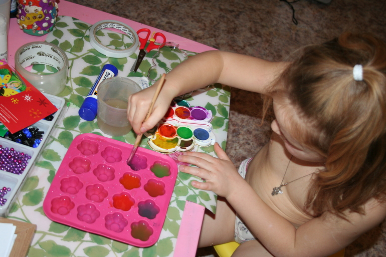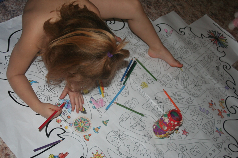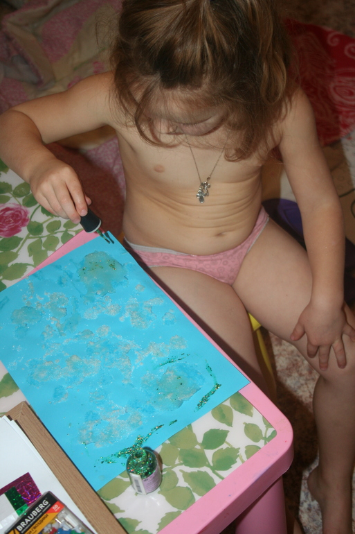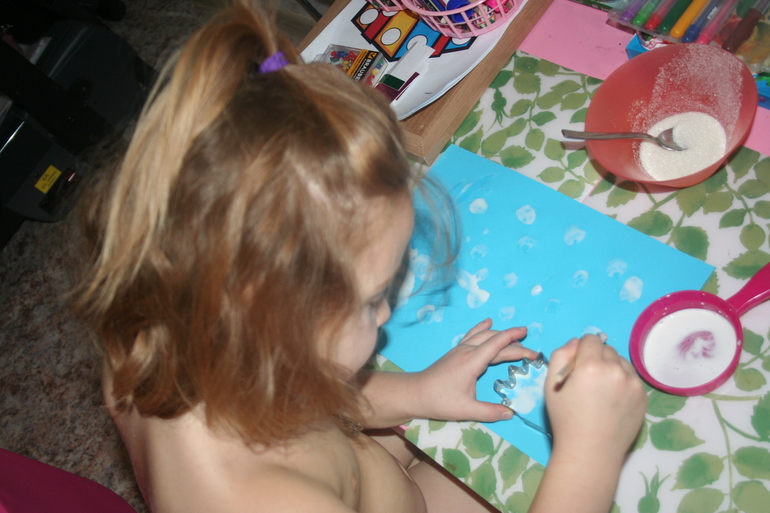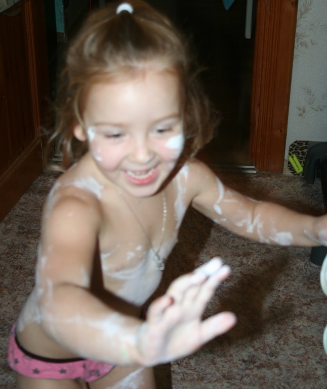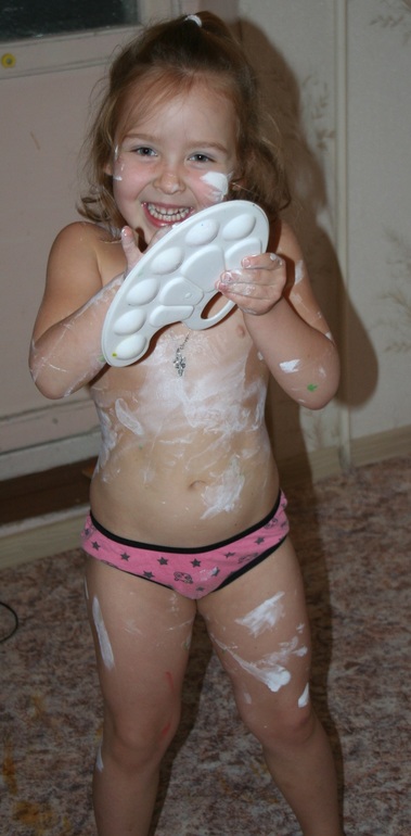 В один из дней, устав от бумажных снежков, Камилка предложила поиграть с белой краской. Ох, и извазюкались мы, но было чудесно :-)