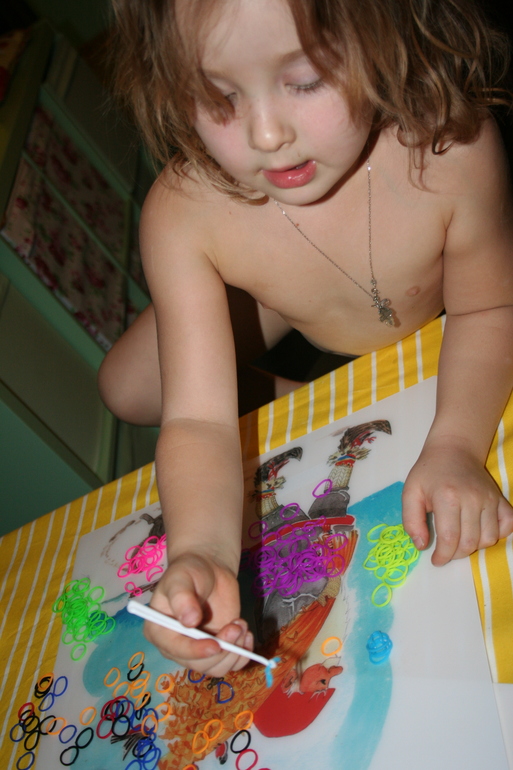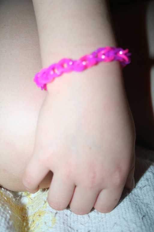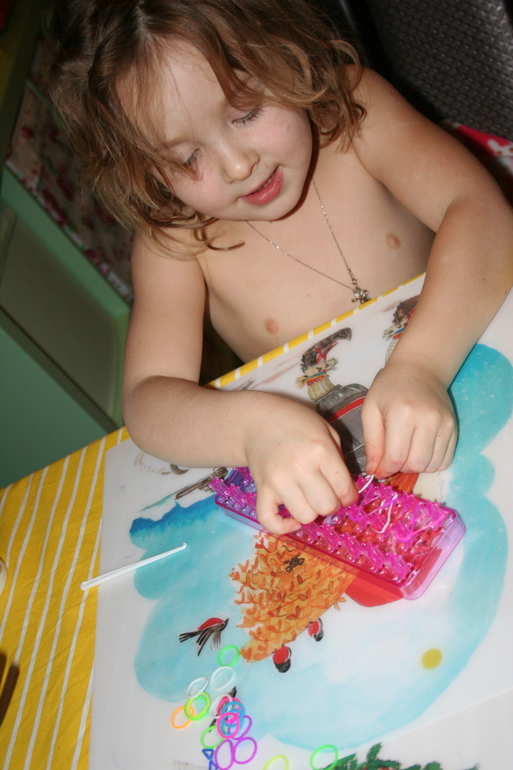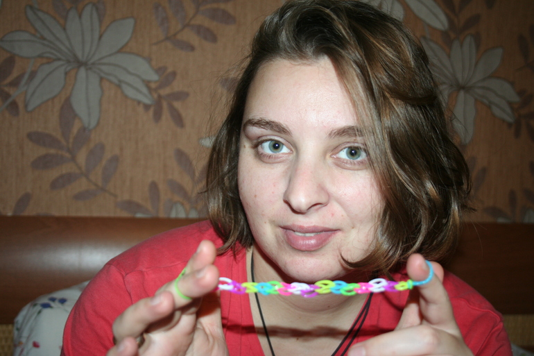 Пока мы его только осваиваем, и изделия получаются не очень красивые, но процесс увлекательный, тем более резинки можно еще и сортировать по цветам, да, еще и не руками, а палочкой :-)