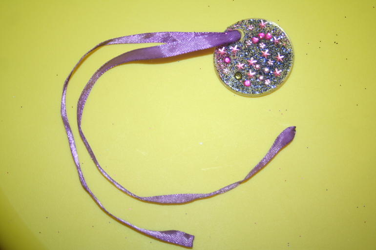 Продолжили делать украшения из подарочного набора. Получилась у нас вот такая "Медаль за красоту". Уже не знаю, что и придумать, чтобы отучить дочку совать кошку в лицо, ходит вся в царапинах, как бандит :-(
