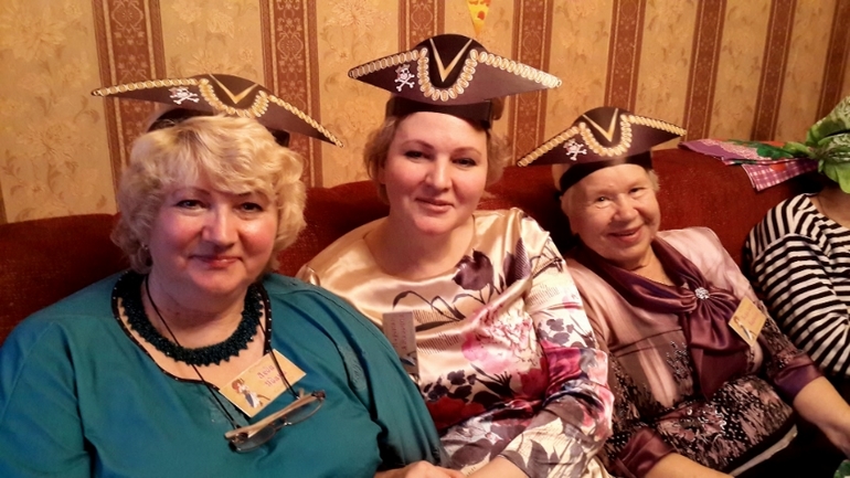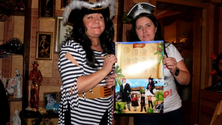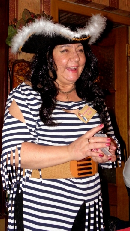 6) После этого чтобы отдохнуть от конкурса я обьявила мою маму,бабушка вызвалась исполнить номер для именинника под песню Говорят мы бяки-буки,спела и немного осыпала всех картами) За это мы ей вручили памятный подарок,колендарь с нашей пиратской семейкой)