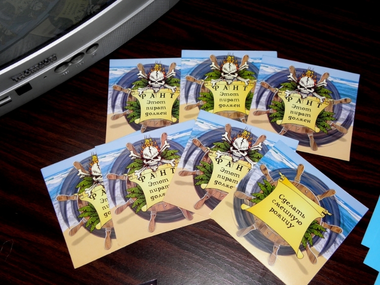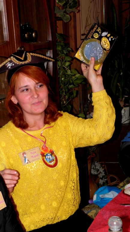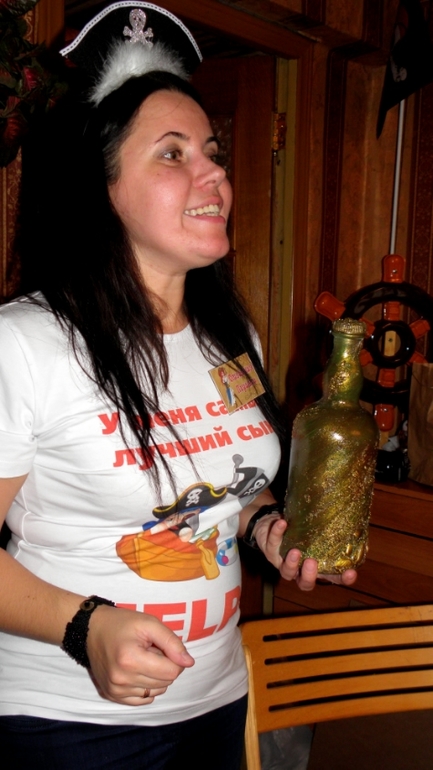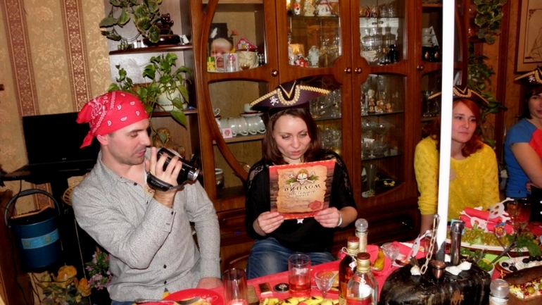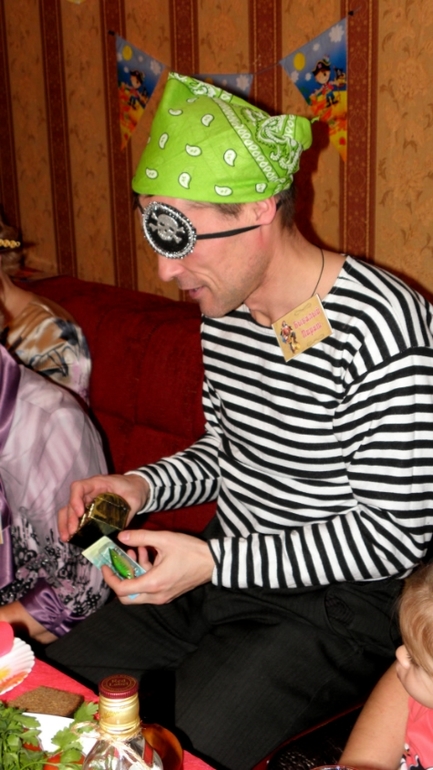 3) После тостов от гостей,я провела конкурс "Настоящий пират" (моя идея,увидела список пиратских фраз и решила сделать из этого конкурс на знание,обычно все спрашивают названия кораблей и т.д.,так по моему веселее получилось),суть его: я озвучиваю пиратскую фразу,а мне должны обьяснить,что имеет ввиду при этом пират) Получился веселый конкурс,все смеялись и спорили,ответы были смешные,каждый старался заработать побольше пиастр,которые мы раздавали при правильных ответах) У кого больше пиастр,тот и есть Настоящий пират,которому я вручила в итоге: тельняшку,наглазник,диплом и медаль Настоящего пирата)