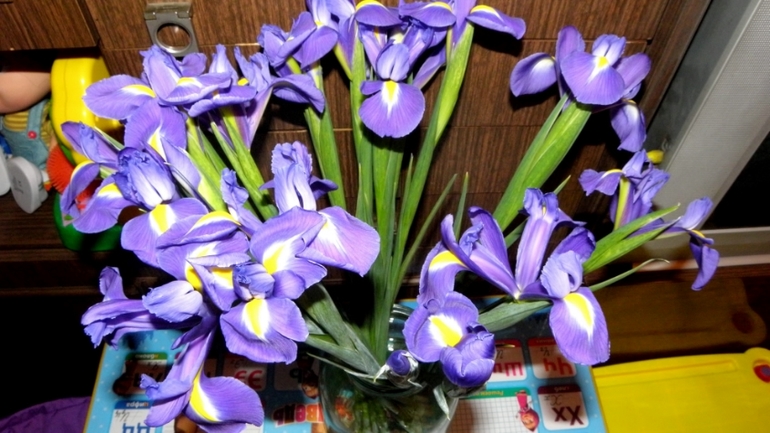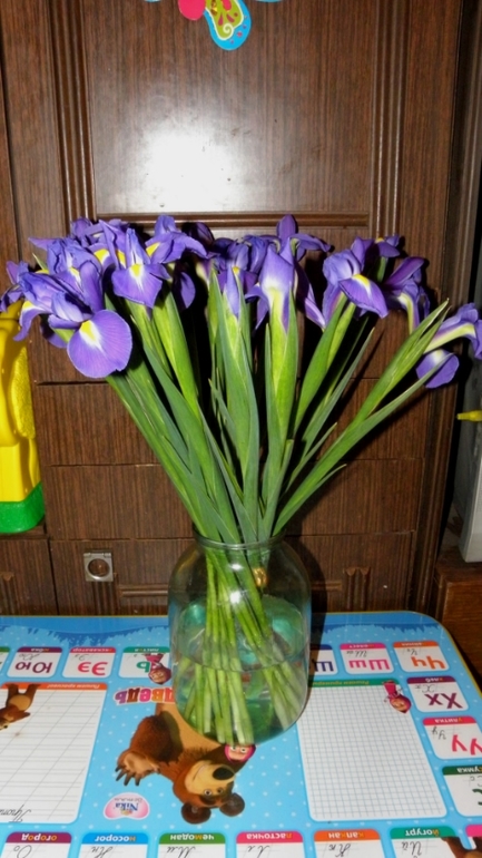 Так как ДР выпал на середину недели,подарок (один из...) от нас мы вручили ему перед садиком,я получила от мужа букет ирисов....муж подарил мне такой букет на рождение Матюхи в роддоме