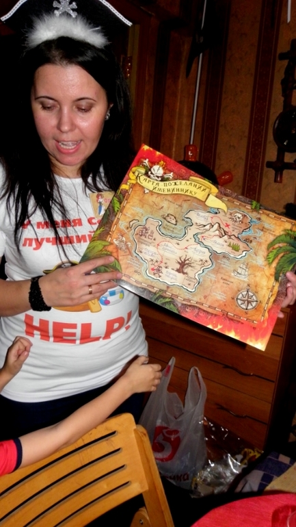 8) Затем я решила провести конкурс "Поиск клада капитана Флинта",чтобы сын все таки в чем то поучавствовал) Я на карте написала названия комнат,у меня везде висели таблички на дверях,где были подсказки,после этого я загадывала загадки и гости все помогали Матвею разгадывать их,где же спрятана следующая подсказка,как только Матвей узнавал где,бежал и искал ее,потом приносил подсказку,на которой было написано название следующей комнаты,где была спрятана следующая подсказка и я снова загадывала загадку,гости отгадывали ее и Матюха несся снова ее искать,в общем все были задействованы и причем сидя за столом,а Матвей получил удовольствие бегать и искать подсказки и найти наконец то свой клад в виде пиратского сундука)А так же к сундуку вручила ему Диплом Настоящего пирата и медаль)