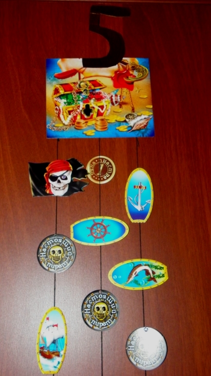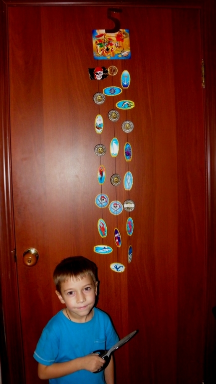 Как же все начиналось...Тему пиратскую выбрал сын,на мой вопрос,кого он хочет видеть на своем ДР,он твердо сказал - Пирата) После того,как я пообещала ему пригласить настоящего пирата на ДР,все его мысли были о ДР,он каждый день задавал мне воросы,когда -ну когда же он начнется,все это происходило за полгода до ДР и я честно подустала ему отвечать и обьяснять) Где то увидела и мне понравилась идея подсчета дней до праздника в виде календаря обратного отсчета) За месяц до ДР мы с Матюхой его быстро сделали из подручного материала и после этого наступил мой покой) Матюха подошел с энтузиазмом к этому делу,отрезал по одной бумажке каждое утро,как просыпался и больше не мучил меня вопросами,так как сам видел и мог посчитать,сколько же дней осталось до дня икс)