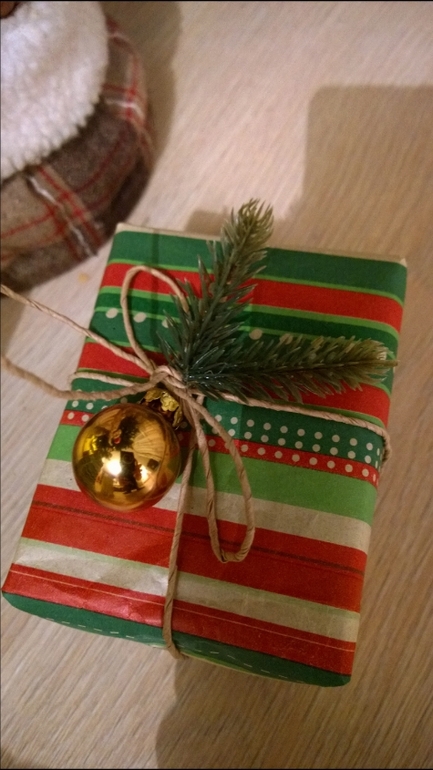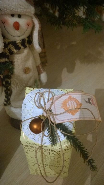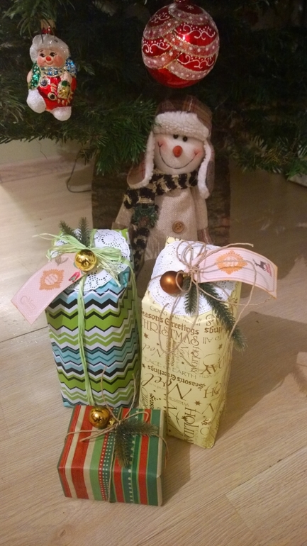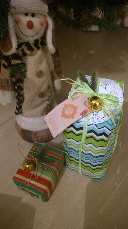 А я упаковала в бумагу с новогодним рисунком,а сверху прикрепила индивидуальные открытки с фото того,кому адресован подарок)