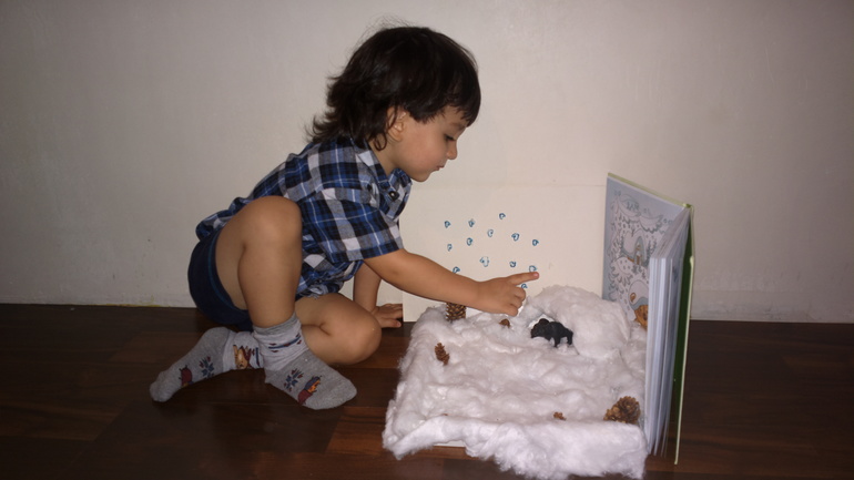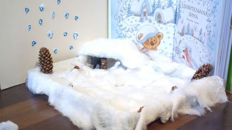 Наши падающие снежинки сделаны в виде пуховых варежек.Тигран проследил, чтобы все декорации соответствовали сказке. Сказка Г. Цыферова "Медвежонок" о том, как маленький Медвежонок очень ждал зиму и за снег принимал то тополиный пух, то парашютики одуванчика. А когда выпал первый снег, то Медвежонок не поверил и сказал: "Это просто дождь надел пуховые варежки"