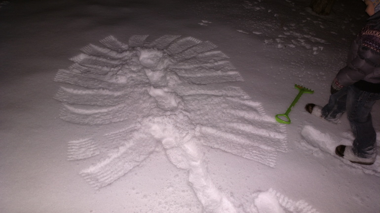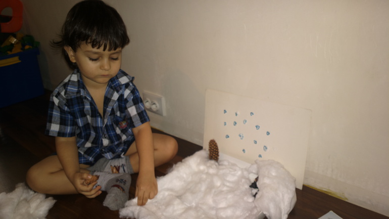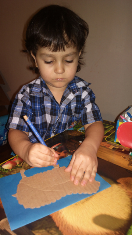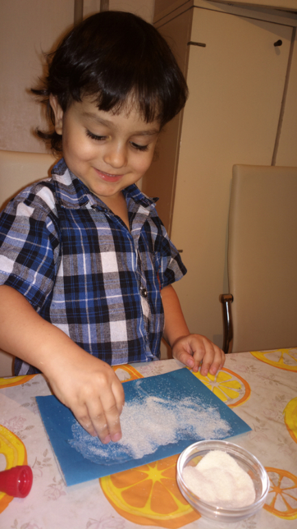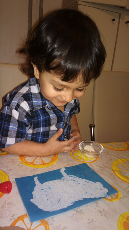Это было задание ТИграну от Деда Мороза, в письме мы получили инструкцию и картонный шаблон овечки. Тигран обвел по контуру шаблон, замазал овечку клеем пва и посыпал манкой.![]()