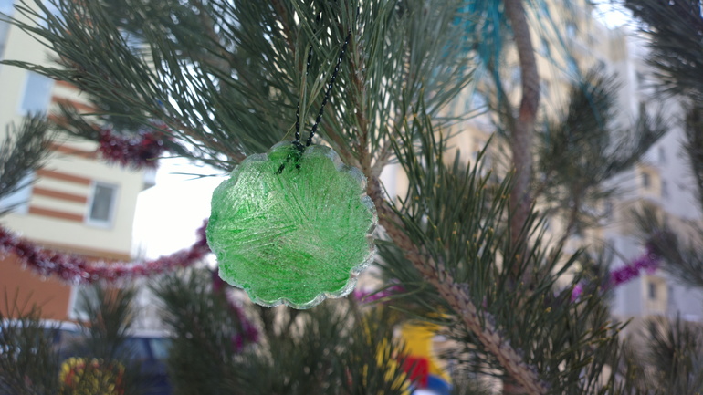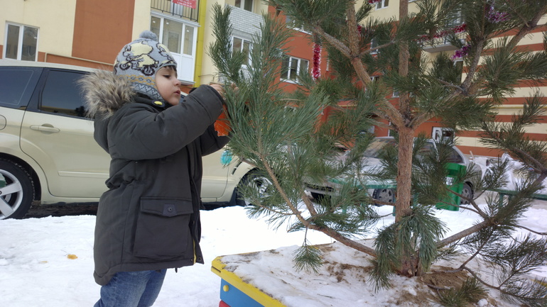 Во дворе у нас появилась елочка, мы сделали ледяные игрушки и пошли украшать:![]()