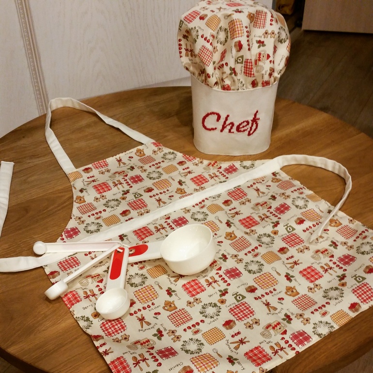Ткань видимо для пэч-ворка, купила в обычном магазине "Ткани". А выкройку взяла в интернете: просто забила "как сшить колпак и фартук повара для ребенка"