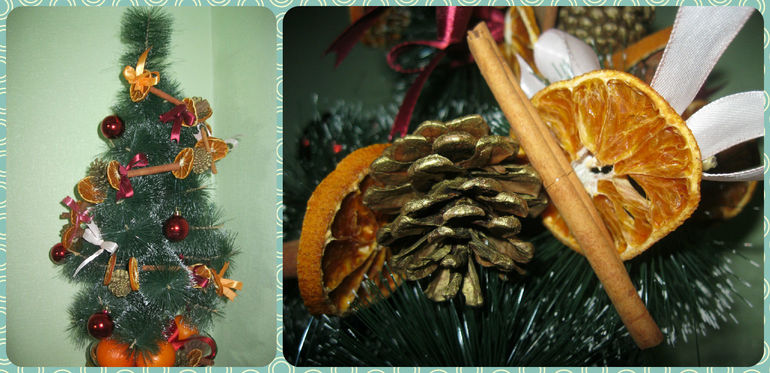 Вторую елочку - маленькую - мы поставили на кухонный стол. Елочку украсили ароматной гирляндой (идею взяла здесь http://www.babyblog.ru/user/moment/78823)