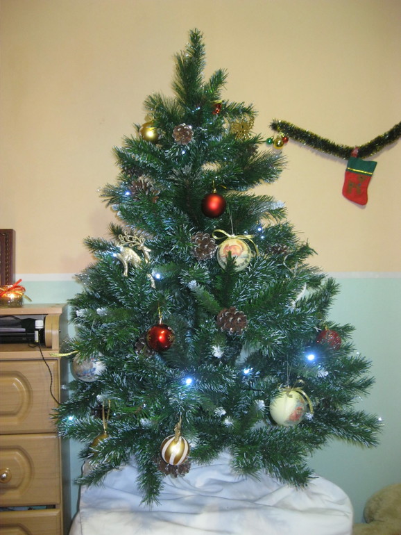 Елочка у нас искусственная. Но, на наш взгляд, очень симпатичная и пушистенькая)