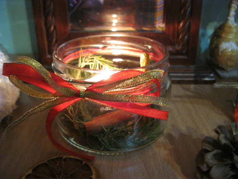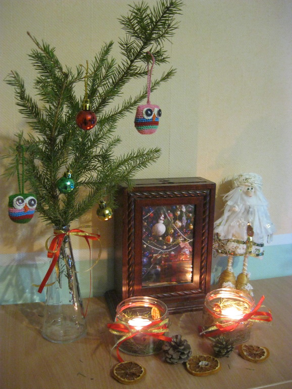 Еще я оформила небольшую композицию на комоде (вернее, слепила из того, что было)): еловые веточки, рамка с новогодним фото, вырезанным из журнала, найденный в закромах лесовичок и "фонарики" - обычные баночки с еловыми веточками, корицей и кусочками мандаринок. Свечки зажигаем - сказка...