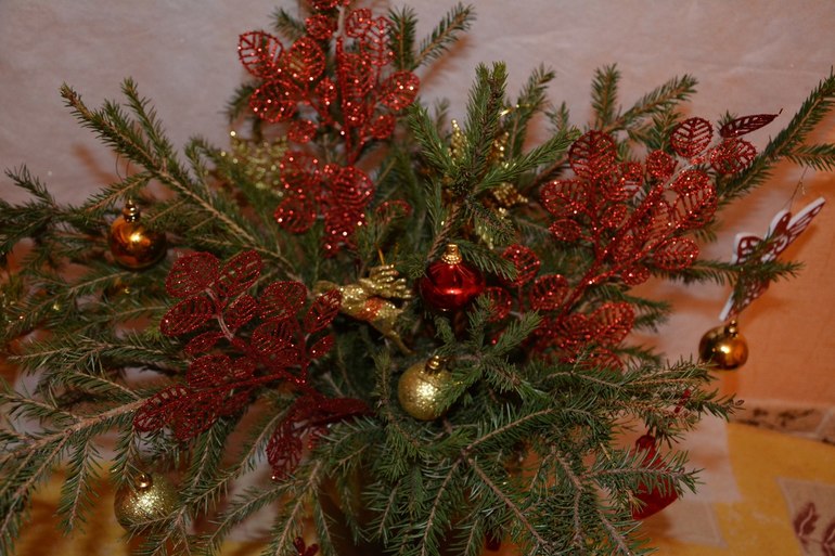 Новый ГодДевочки признаюсь впервые в этом году я все таки решилась на живую елочку Но правда на всю елочку пока нет а только на веточки ... и вот эти веточки как то принес нам папа (папа их приобрел на елочном базаре так что закон мы не нарушали и вандалами не были) мы поставили в огромную вазу и нарядили с дочком и теперь вдыхаем елочный аромат вместе с запахом мандарин (ваза у нас стоит на кухне а рядом чаша с мандаринками) ... Так что у нас уже давно пахнет Новым годом...
