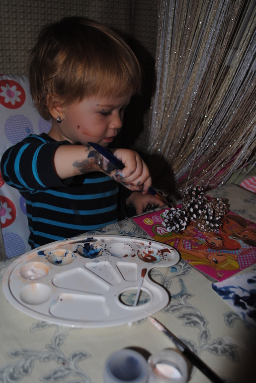 Предновогодняя подготовка была не такая активная как у большинства деток,думаю на следующий НГ мы будем взрослее,возможностей и желания тоже будет больше.Но все таки мы что-то делали. Мы очень полюбили рисовать,много картинок распечатали новогодних,вот их и разукрашивали.Еще шишки на венок дверный разными красками и камушками делали.![]()