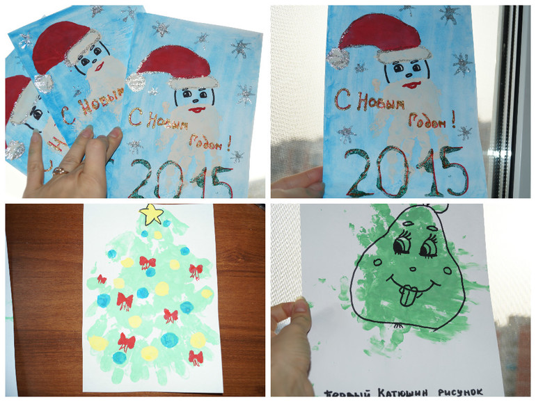 Потом мы оформили открытки для бабушек, дедушек, двух наших тетек, ну и конечно же для нашего папульки) -рисовала конечно же я сама, НО борода Деда Мороза это отпечатки рук доченьки (ей правда не особо понравилось когда я гуашью ей руки измазюкала...) Еще порисовали пальчиковыми красками, она намалевала что-то хаотичное, я это искусство обвела маркером -получилась грушка- и теперь этот (не побоюсь этого слова) ШЕДЕВР