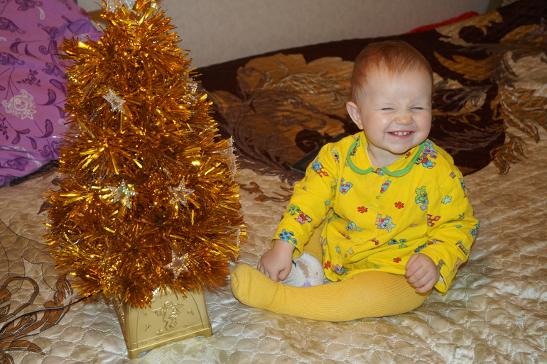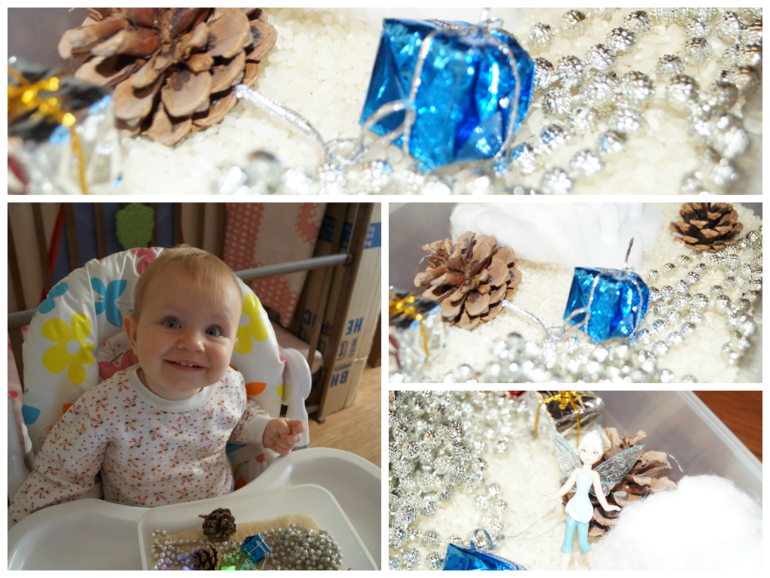 Достали елочку нашу маленькую , доча сразу проявила к ней интерес, только вот фотографироваться она не особо любит, то ли вспышка ее раздражает, сразу глазки жмурит, хитрющая тут такая!Сделала ей сенсорную коробочку, два раза с ней поигрались, рис был по всей квартире...Но у ребенка счастья было то сколько!