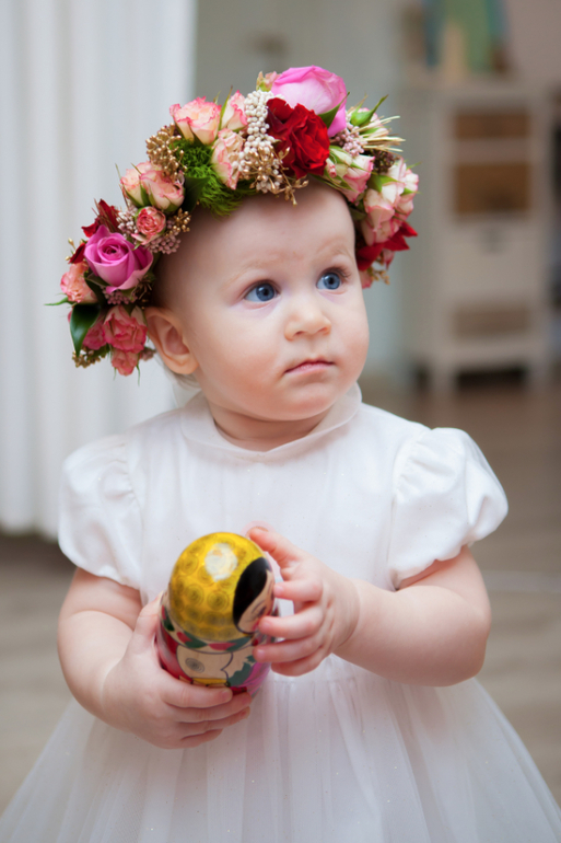 это самое оригинальное оформление, что я видела на ББ! Вы молодец, очень интересная идея :) Матрешки на платье были или тоже мамина задумка? )))) Венок живой или искусственный?