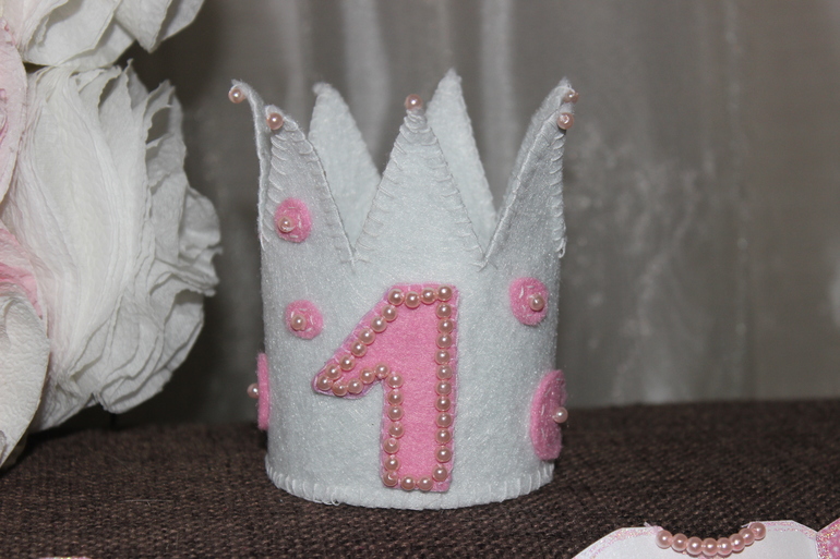 1) единичку (цветочками сделали только с 3-х сторон, заднюю стенку просто обклеили белой бумагой, но если честно смысла обклеивать со всех сторон я не вижу) , корону из фетра (подглядела идею у кого-то на ББ, но переделала под наш стиль), юбочки к бодикам-шпажкам:![]()