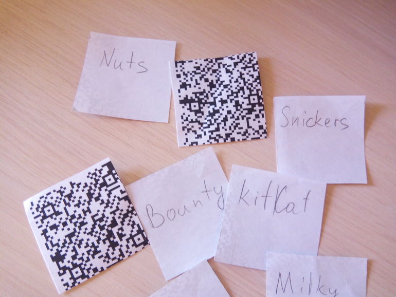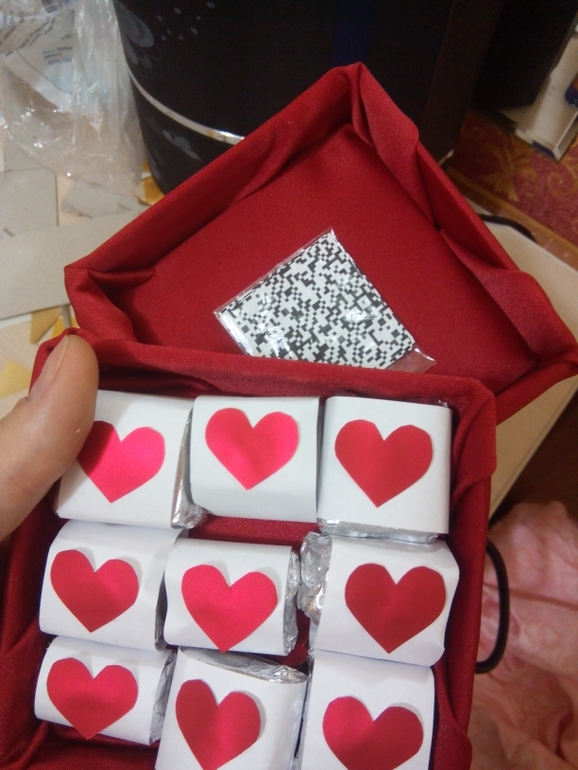 Создан текст поздравления в QRCode-генераторе (например, ), этот код распечатан и разрезан на 9 частей. На обратной стороне написаны названия шоколадок, главное - в правильном порядке угадать и разложить.