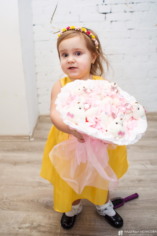 Отдельно заказывала вешалку специально для фотосессии, топпер в торт, ободки для желтого платья тоже ручной работы.
