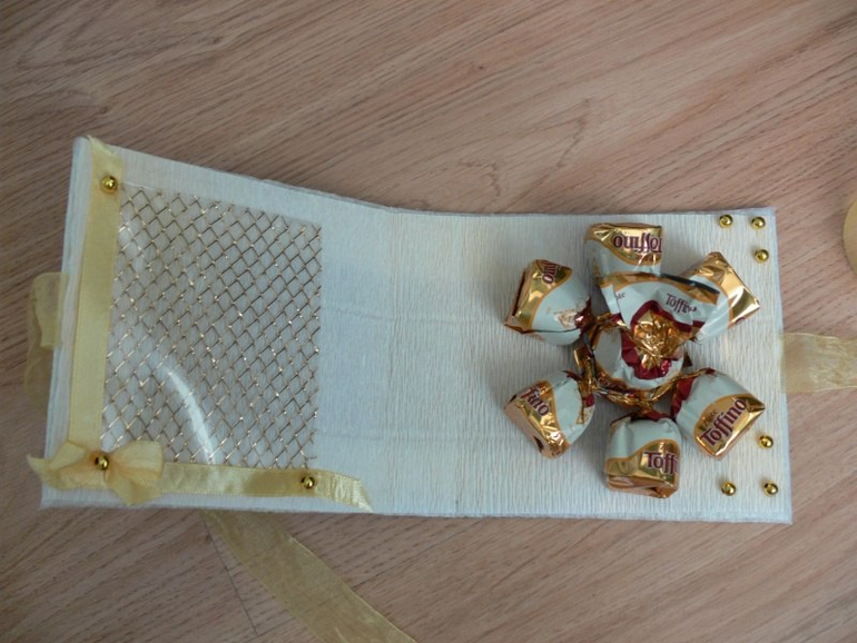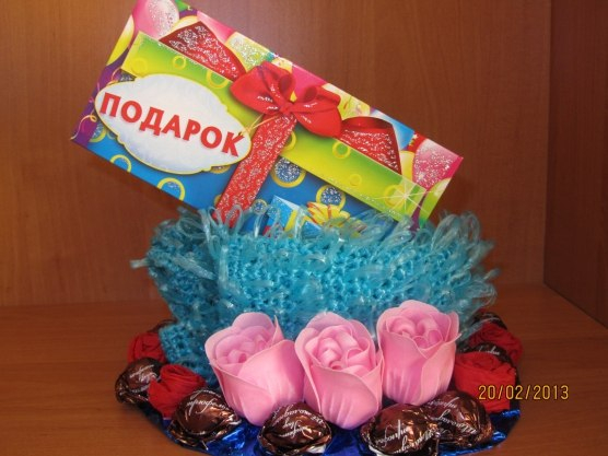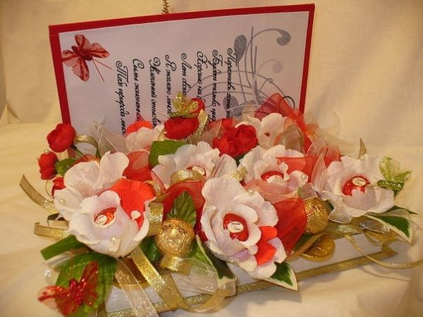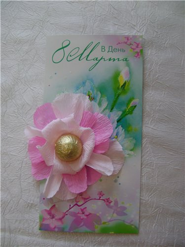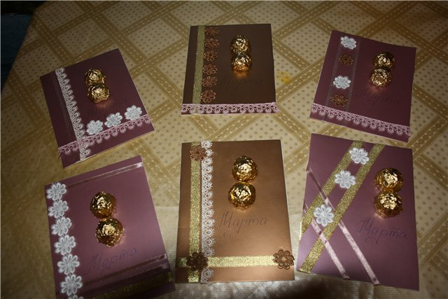 Мы как-то вот такое делали. в этом году остановимся тоже на варианте открытки с конфетами.