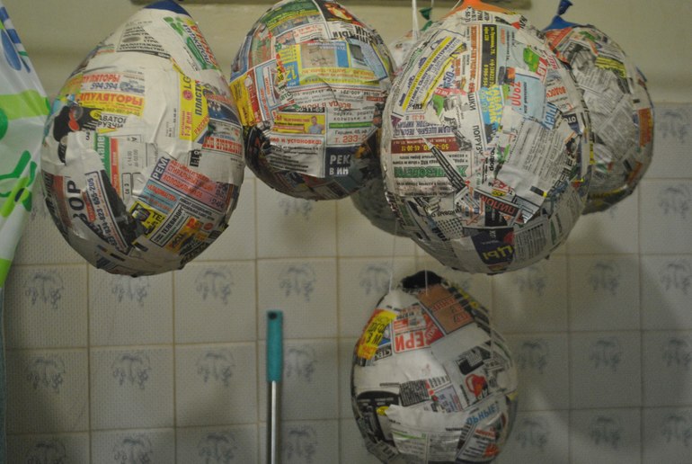 обклеивала шарики газетой на клей пва,клея ушло 2 ведерка(в магазине строительном брала)на один шарик,на один слой хватает одного тюбика(я думала не много клея надо,а потом ведерки купила)каждый слой,сушила сутки,в общей сложности на 6 пиньят ушло 2недели работы,по 1-1,5 часа в день.