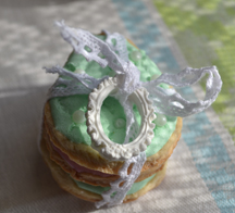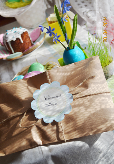 А еще гостям мы приготовили такие конвертики,в них яичко и печеньки,связанные кружевом и украшены .