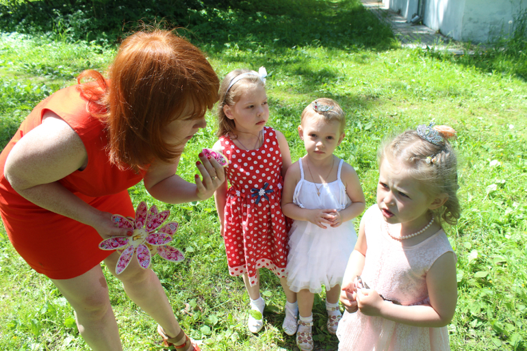 Дальше карта привела нас к Музыкальному крыльцу, где ребята обнаружили волшебные дудочки, на которых надо было сыграть песенку всех именинников - "Пусть бегут неуклюжа..." Остальные дети и взрослые подпевали.