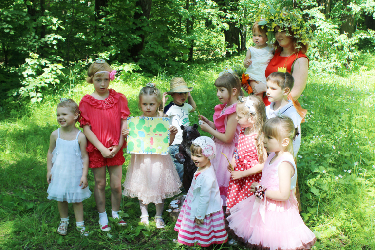 Следующее испытание "Накорми мишку". Ключ для команды зарабатывал тот, кто собирал больше ягод на полянке у медведя. (Ягоды были вырезаны из бумаги и разбросаны на полянке)