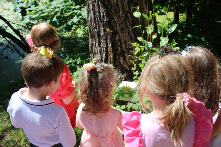 Первое испытание нам устроила царевна-лягушка. Она жила у пруда ( к слову, там квакают лягушки, поэтому вышло очень реалистично и эффектно) и припрятала много ценных вещиц в своем кармашке. Задача детей была на ощупь определить, что это такое, и только если все правильно отвечали, им вручался ключ.